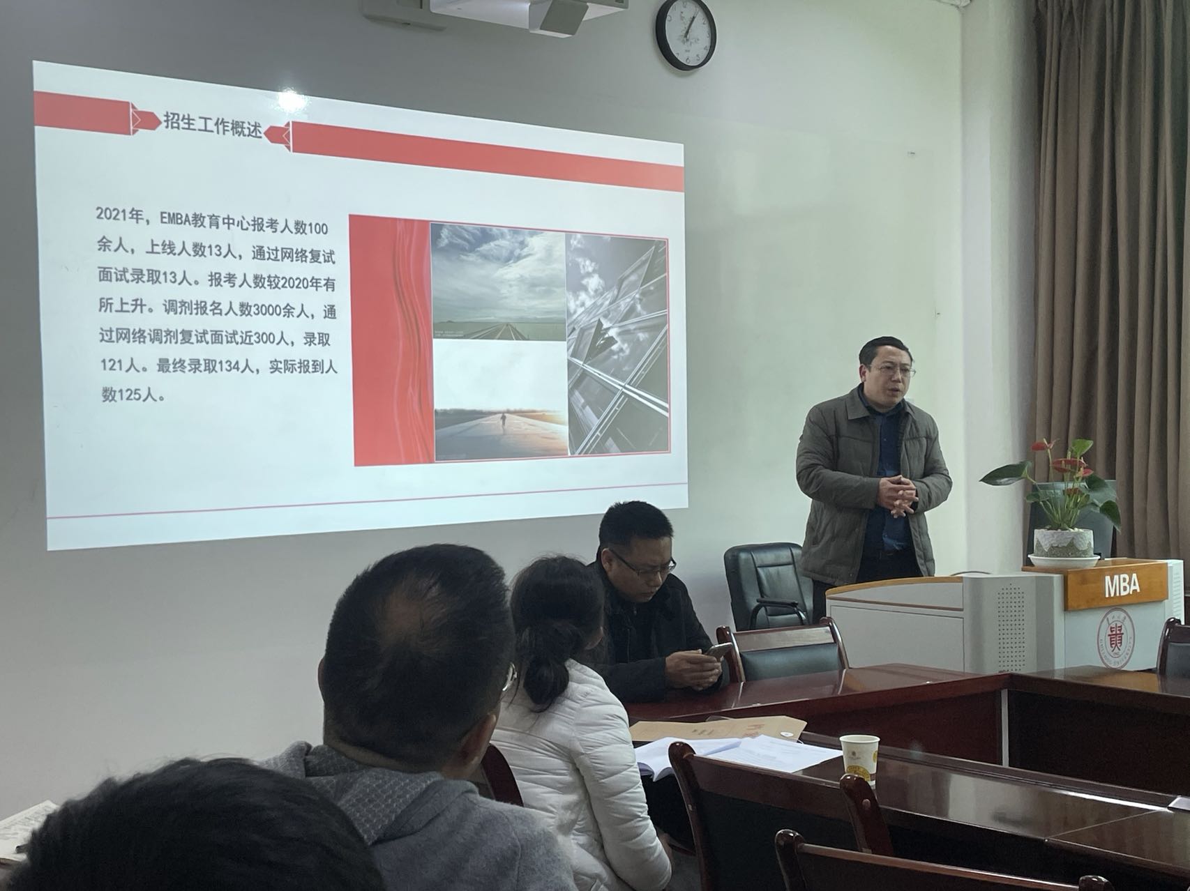 李雨峰老师介绍了EMBA在2021年所做的工作,分析了EMBA的生源结构、指出了EMBA在招生人员逐年提高的情况下所面临的困难、以及明年EMBA的工作计划等。