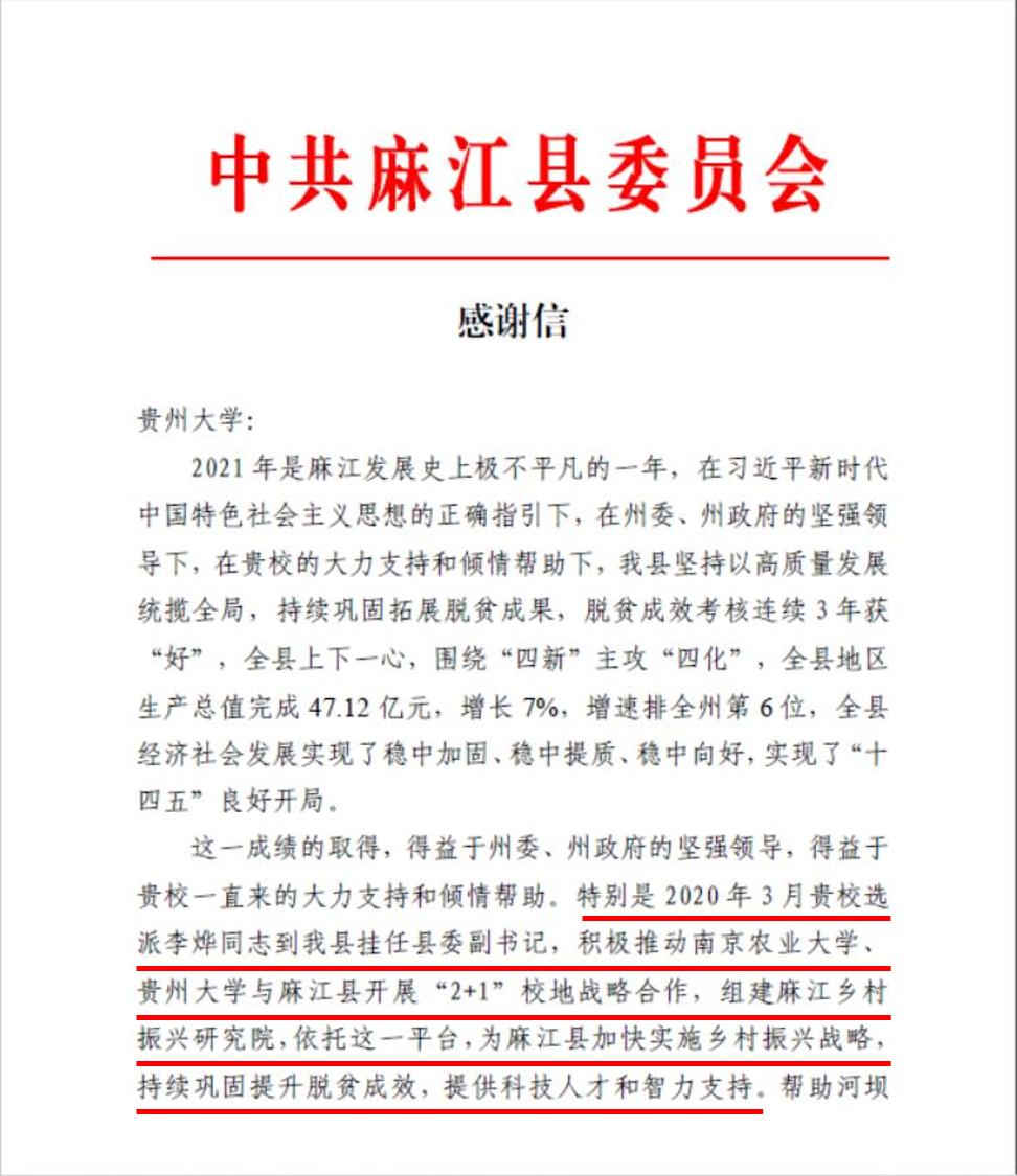 信中特别指出,官方网站院长李烨在挂任麻江县委副书记期间,积极推动南京农业大学、贵州大学与麻江县开展“2+1”校地战略合作,组建麻江乡村振兴研究院,依托这一平台,为麻江县加快实施乡村振兴战略,持续巩固提升脱贫成效,提供科技人才和智力支持。同时,在帮助申报少数民族传统村落示范村、省级和州级特色田园乡村·乡村振兴集成示范试点,培训各类人员,外资引进和发展教育等方面贵州大学都做了大量卓有成效的工作。