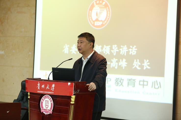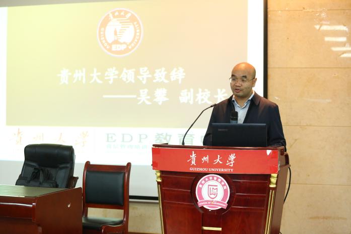 贵州大学副校长吴攀,贵州省委组织部党员教育中心教育处处长高峰,贵州大学党委组织部副部长张瑞良,贵州大学对外合作处副处长、贵州大学教育培训管理工作专班负责人付芳,leyu党委书记王秀峰,leyu院长李烨,leyu副院长宋山梅,贵州大学EDP教育中心主任张勇出席本次培训开班式。
