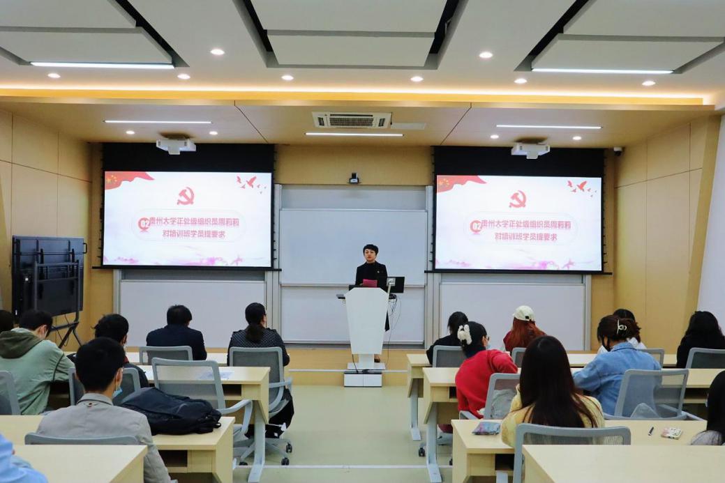 贵州大学正处级组织员周莉莉宣读第三十七期入党积极分子培训班和第十六期党员发展对象培训班出勤、课堂纪律、考试等方面的要求,并对培训所采取的集中培训与自主学习相结合的方式了详细说明。她嘱托同学们务必要以严谨、踏实、自律、负责任的态度对待此次培训。