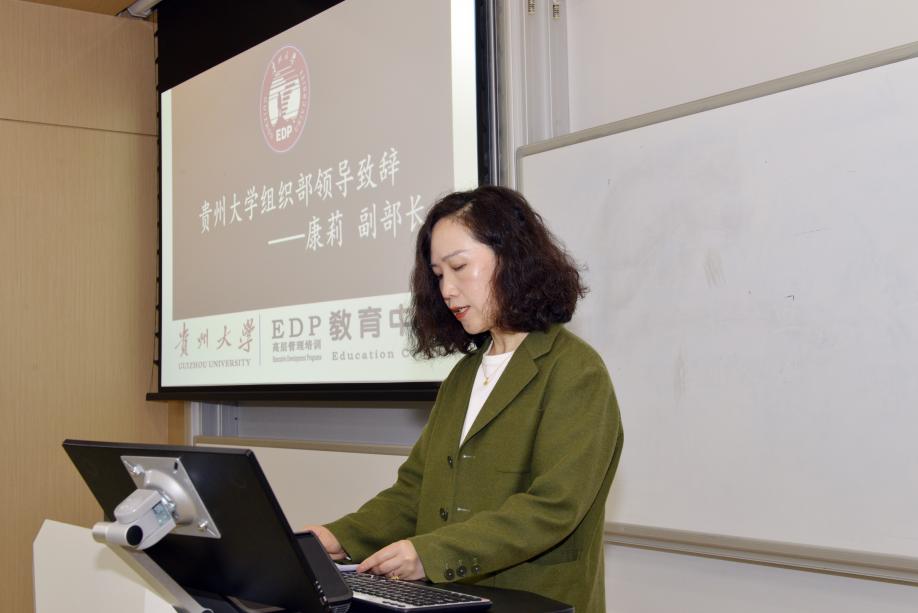 贵州大学正处级组织员、贵州大学教育培训管理工作专班负责人付芳,贵州大学组织部副部长康莉,leyu党委书记王秀峰,贵州大学EDP教育中心主任张勇出席本次开班式,开班式由leyu副院长宋山梅主持。