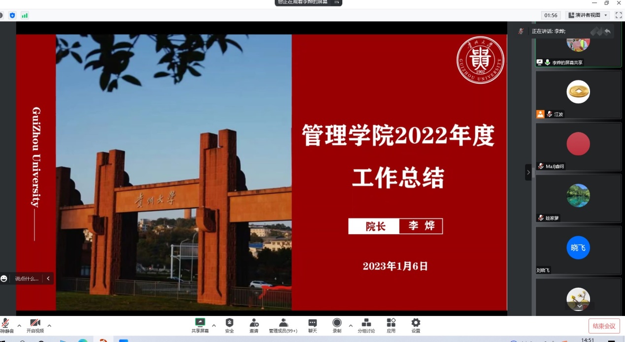 2023年1月6日下午,管理学院线上召开全体教职工大会。院领导班子出席会议,全体教职工参加会议。会议由院长李烨教授主持。
