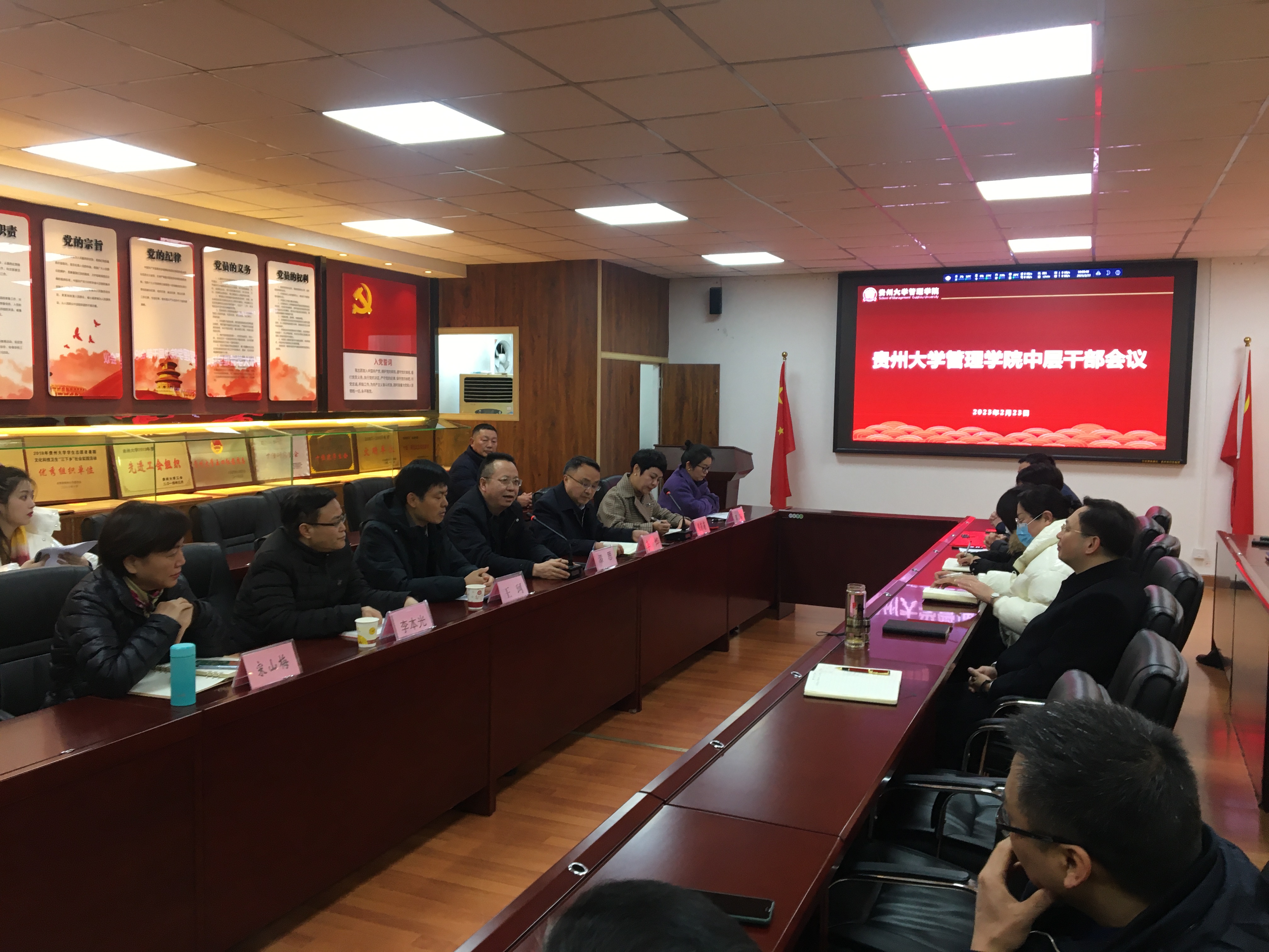 2023年2月23日上午10:00,管理学院在致远楼陈列室召开干部大会,宣布了学院有关领导的任免决定。贵州大学副校长漆思,校党委组织部副部长王珂出席会议,学院党政领导班子成员,中层以上干部参加了会议。会议由校党委正处级组织员、院党委副书记(主持党委工作)周莉莉主持。