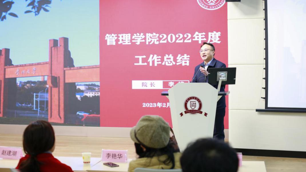 院长李烨作管理学院2022年度工作总结。从人才培养、学科建设、科学研究、交流合作、社会服务、校友(庆)工作等方面对去年学院各项工作进行了通报、总结。肯定了2022年度学院各项工作取得的成绩,也指出了发展中存在的不足和进一步推动发展的思考。他表示,新的一年管院将笃行不怠,勇毅前行,打造国内一流商学院的“贵大维度”,创造管院新的辉煌!