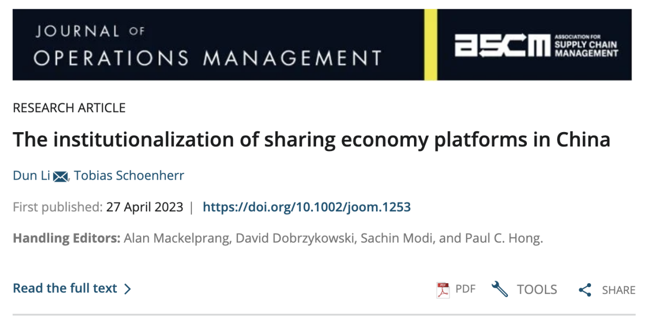 近日,官方网站李盾博士与美国密歇根州立大学商学院Tobias Schoenherr教授合作的研究成果《The institutionalization of sharing economy platforms in China》在运营管理/供应链管理国际顶级期刊《Journal of Operations Management》上在线发表。李盾博士为第一作者和通讯作者,leyu为第一署名单位。