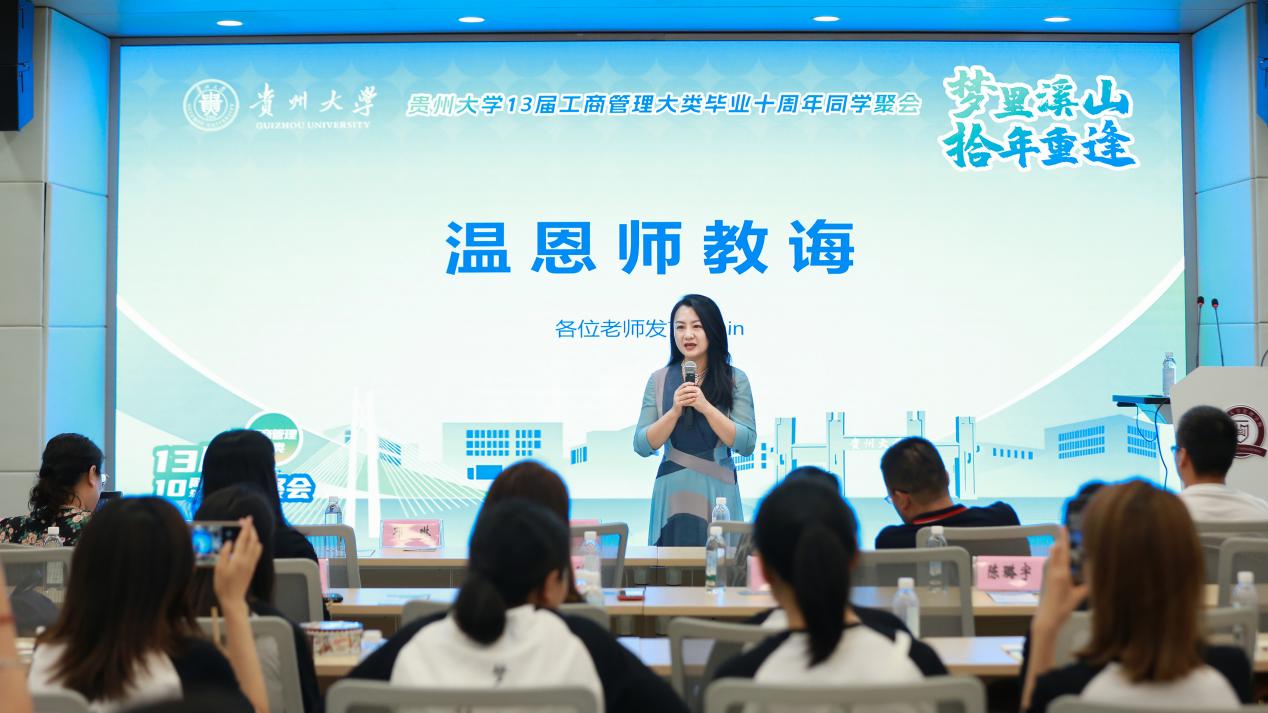 袁新国老师是2009级工商管理大类辅导员兼班主任,她回顾了校友们在校期间学习生活的点点滴滴,表示十年光阴如箭,同学们青春依然,但又多了一份成熟和自信,她感到很欣慰,并祝福大家前程似锦,未来可期。