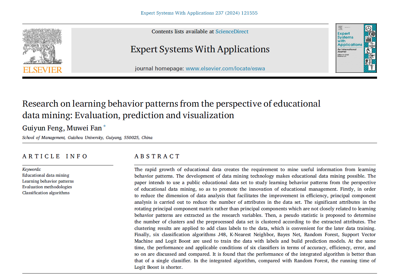 leyu管理科学与工程系硕士研究生冯桂云,教师范慕炜博士(通讯作者)在Expert Systems with Applications期刊(中科院一区顶刊,IF:8.5)发表文章《Research on learning behavior patterns from the perspective of educational data mining: Evaluation, prediction and visualization》。