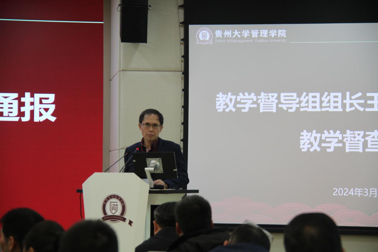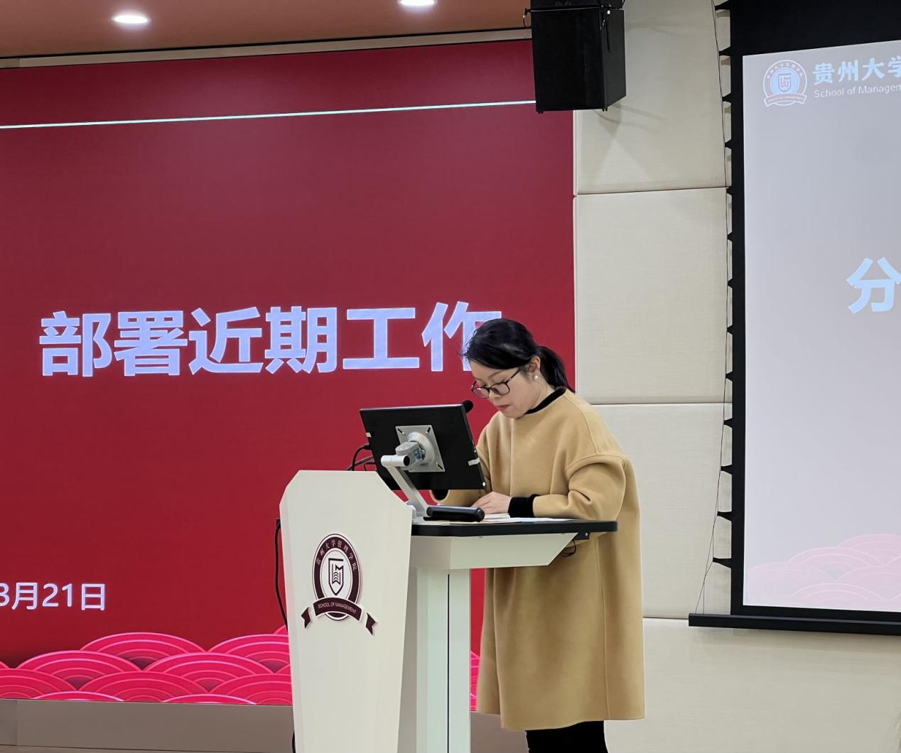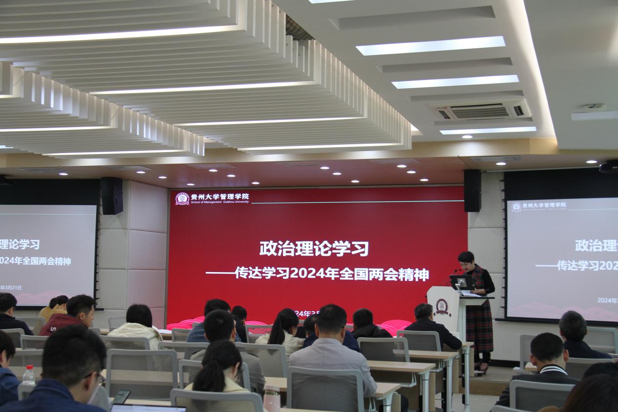 会议第一项,贵州大学党委正处级组织员、管理学院党委副书记(主持党委工作)周莉莉带领全体教职工开展政治理论学习。首先传达学习了全国两会精神,重点对《2024年国务院政府工作报告》进行传达学习,强调了“新质生产力”“高质量发展”两个关键词;同时,周莉莉书记还带领大家重温“习近平总书记‘3.18’重要讲话”,再次强调了思想政治理论课的重要性;传达了贵州省教育工作会议精神,强调了“七个聚焦”、“五个必须”等内容,并强调广大教职工要加强师德师风的学习。