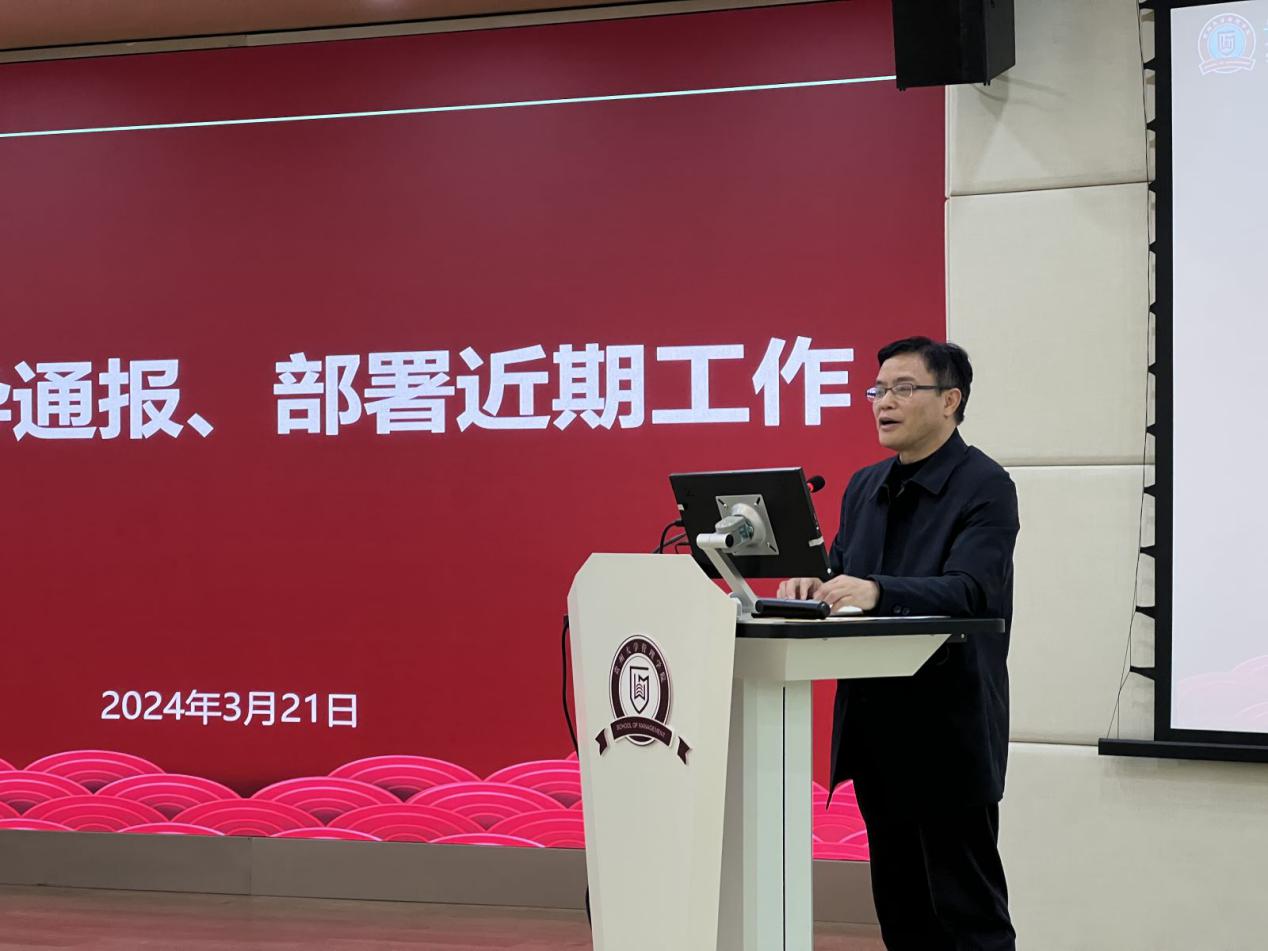 院党委副书记邓琳对学科竞赛、学生工作、“博学计划”工作、毕业生就业情况、征兵工作、校园招聘会工作以及校园车辆管控、工会工作和警示案例等做了通报和部署;副院长李本光对研究生培养、科研工作、学生论文完成情况等工作作了通报与部署;副院长许为宾介绍了本科教育教学审核评估工作进展,分别从学院迎评促建工作概况、已完成工作情况、下一步工作部署情况三方面进行详细介绍。