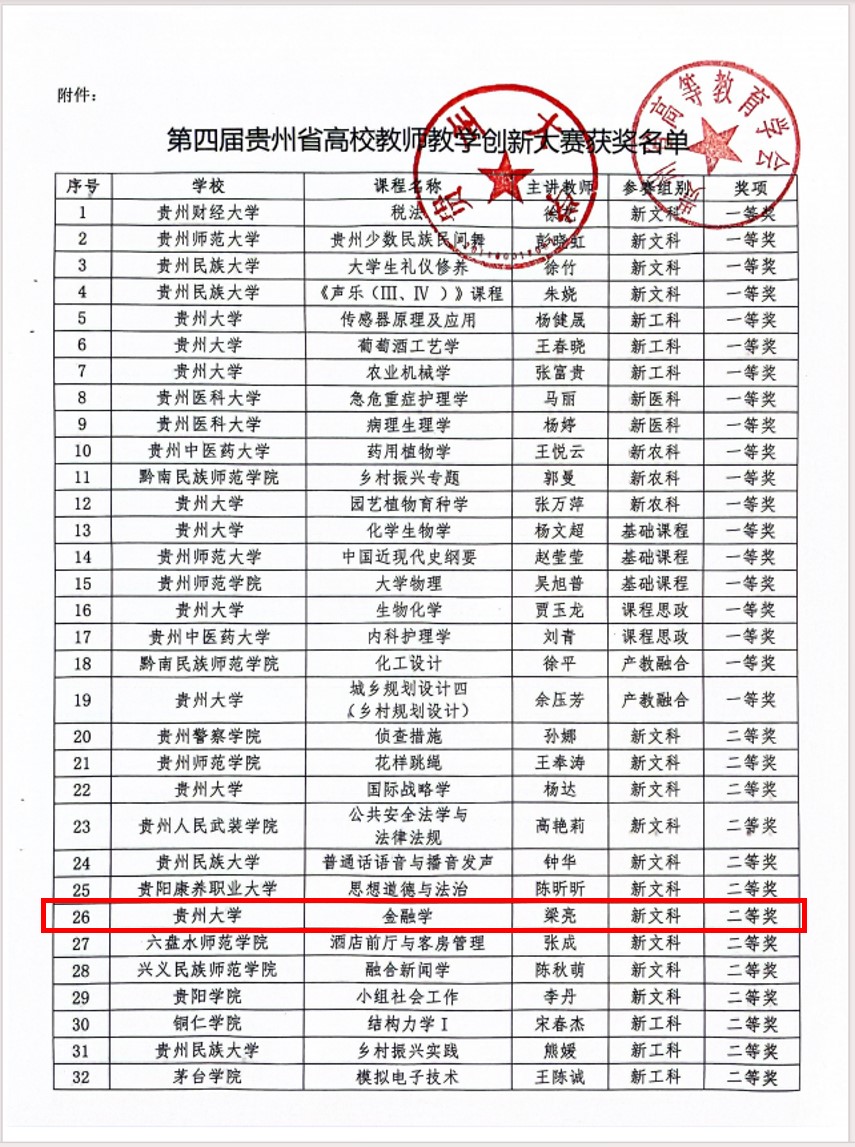 管理学院在第四届贵州省高校教师教学创新大赛中取得优异成绩。学院会计系梁亮老师获新文科组二等奖。