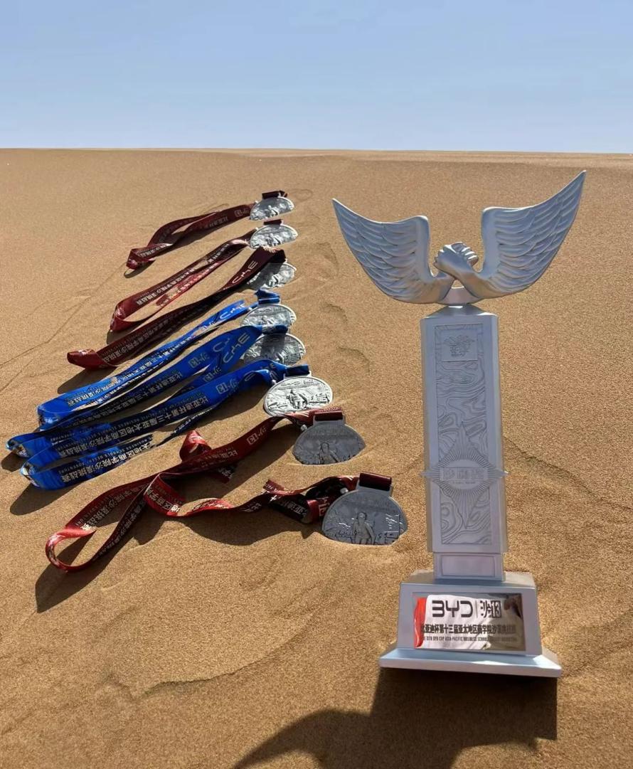 在终点,全员相互拥抱,喜极而泣。亚沙之路,环境恶劣,何其艰难,AB队队员需要完成三天70公里全沙漠越野的挑战,C队队员在完成35公里全沙漠越野挑战的同时,还要做好全员的后勤保障。在这片广袤无垠的沙海中,每一位参赛队员都是无畏的勇士,他们肩负团队荣誉和个人梦想,乘风破沙,勇往直前,这来之不易的沙鸥奖弥足珍贵,全员也用非凡的意志和坚定的步伐实现了出征前对自己许下的承诺:誓夺沙鸥!