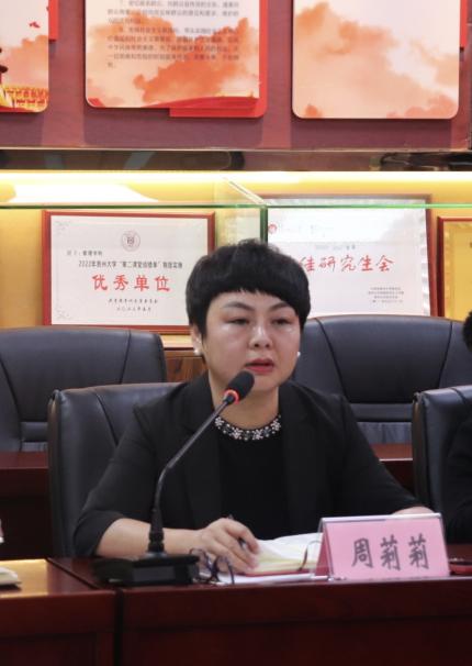 校党委正处级组织员、院党委副书记(主持党委工作)周莉莉对目前工作进展进行全面分析与总结。结合校本科教学审核评估第二督导小组反馈意见,对教学大纲、试卷、自评报告、教学档案及课程育人目标、达成度分析等的规范性情况和完成情况作了通报。她强调,各系主任需对以上问题引起重视并及时对相关资料进行补充完善。