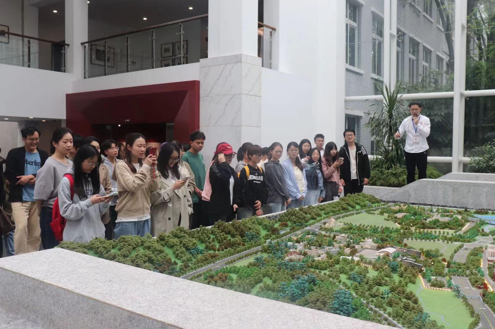进入校史馆,映入眼帘的是写在墙上的校训:“明德至善,博学笃行”,这两句话分别出自《大学》和《中庸》,其含义是要求全体贵大师生在做人和做学问方面要追求更好更高的境界,这也是贵州大学对于师生的殷切期望。馆志前厅的“溯源百年,诸流汇聚”浮雕墙下,是贵州大学的沙盘模型。讲解员通过沙盘详细介绍了校园的规模和布局,使大家全面了解学校的发展脉络。另一侧则展示了为贵州大学做出卓越贡献的先贤铜像,时刻提醒着大家铭记和传承他们的精神。