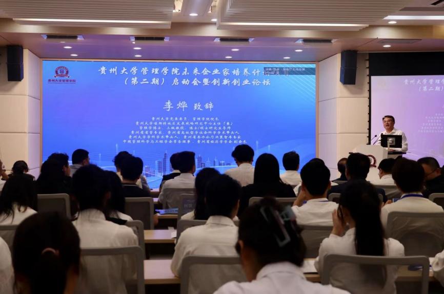 在启动会环节,第一项议程是由管理学院院长李烨教授致辞。李烨院长感谢各位嘉宾的莅临,强调未来企业家培养计划项目旨在培养具有创新精神和企业家潜质的优秀人才,为学生提供更多实践和发展的机会;指出创新创业在当今社会中的重要性,并鼓励学生们积极参与项目,勇于探索,敢于创新。最后,李烨院长预祝本次启动会圆满召开,祝愿未来企业家班第二期学员能学有所成。