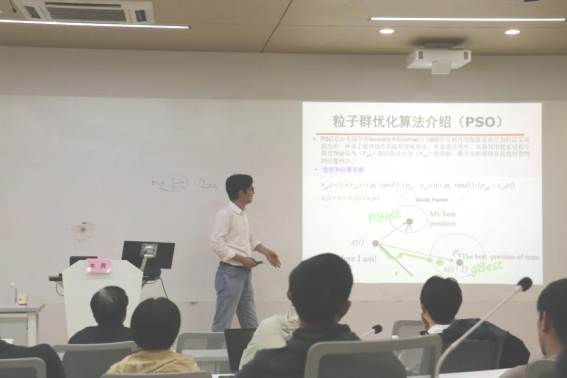 讲座第三项,PSO/BFP模型及改进。他就粒子群优化算法(PSO)和细菌觅食优化算法(BFO)进行了重点介绍,主要介绍了其内涵、研究现状、模型、改进方向、改进代表性工作、改进实验结果,以及相关科研项目。