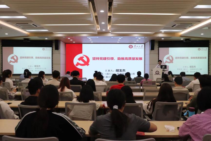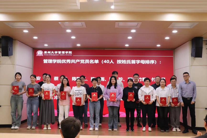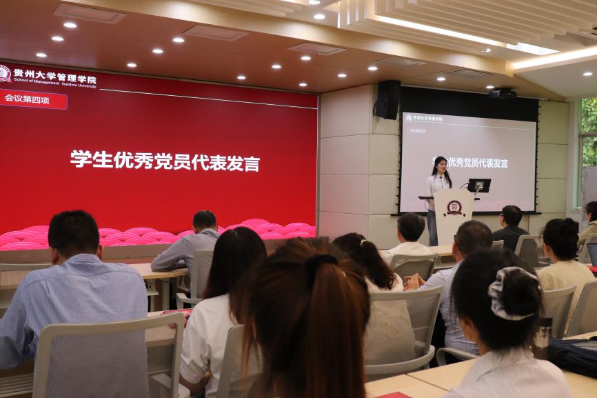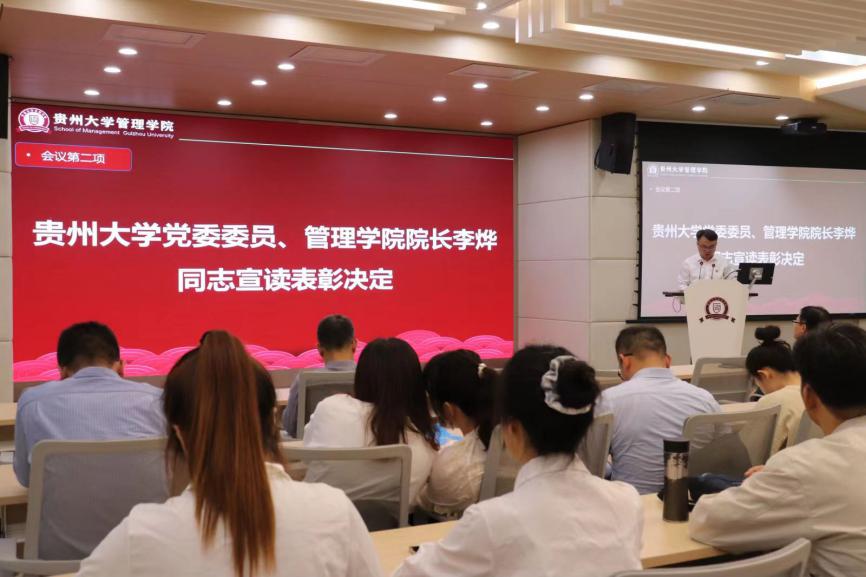 会议第二项,贵州大学党委委员、管理学院院长李烨宣读表彰决定。他指出,表彰先进是为了更好地激全体党员干部奋发进取,进一步推动学院各项事业高质量发展。他号召全体党员以受到表彰的先进典型为榜样,不忘初心、牢记使命,为推动学院高质量发展作出新的更大贡献。这些先进个人中,不仅有辛勤耕耘在教育一线的党员老师,更有许多活跃在学院各个角落的党员同学。他们在推动学院高质量发展、传播“管院好声音”等方面,发挥了重要作用,为全体党员树立了榜样。