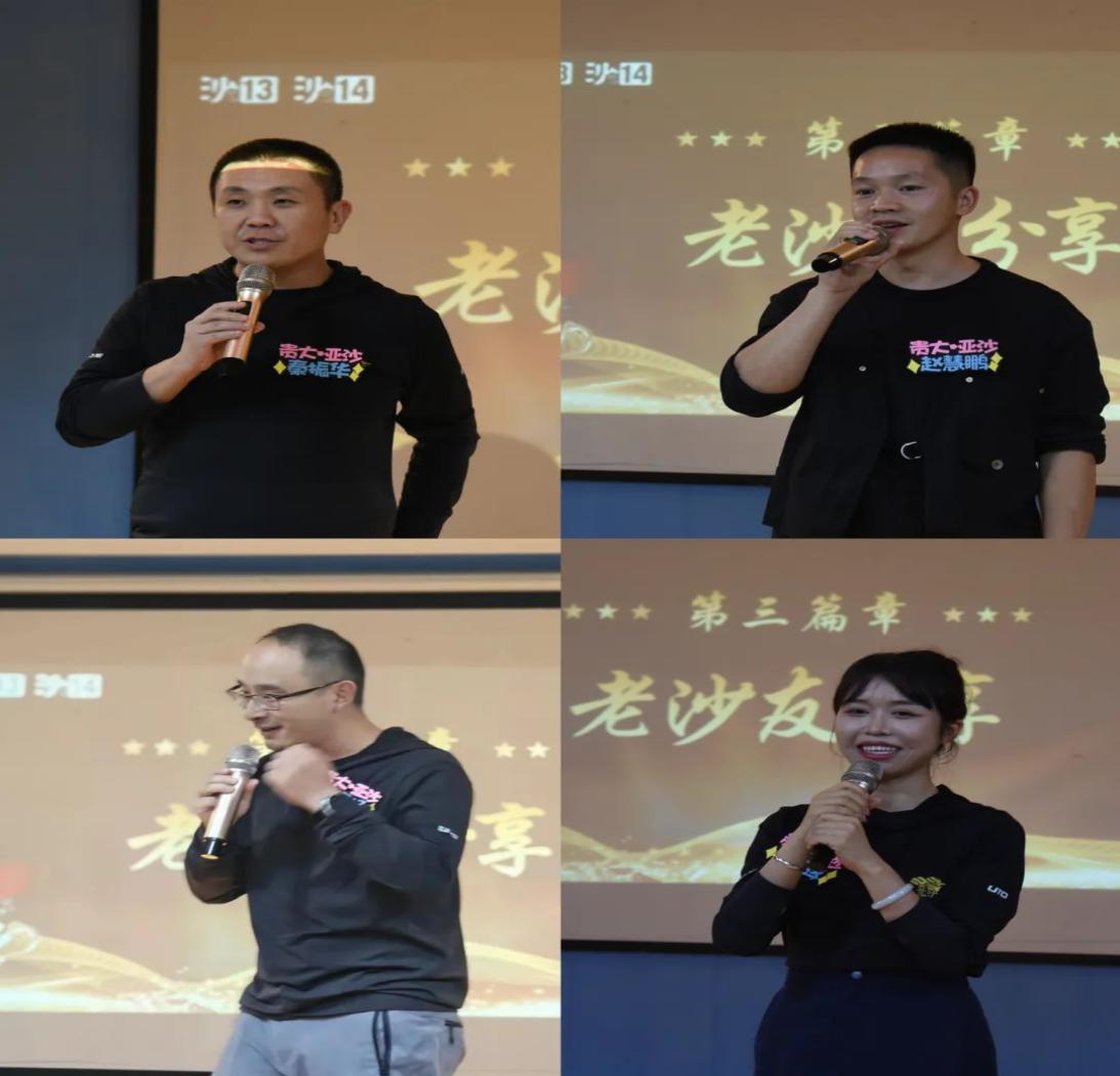 第三篇章:老沙友分享。沙7沙8领队、沙13队长秦振华,沙8沙10队员、沙9领队赵慧鹏,沙11沙13领队刘紫淳,沙9队员、沙10领队、沙13队长童振扬分别上台分享了他们的亚沙故事。感谢所有老沙友对亚沙的努力和付出,呵护和关爱着贵大亚沙茁壮成长。