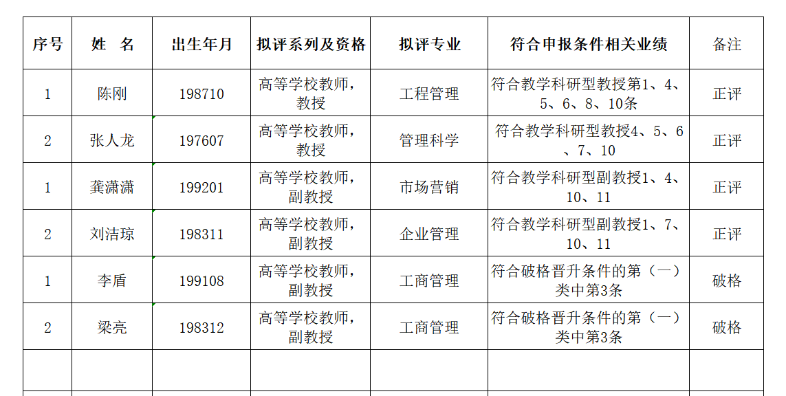 经审核,拟推荐陈刚等6名同志参加2024年度职称评审,现予公示,公示时间: 2024年9月14日-23日(5个工作日) 。对下述人员有异议的,请在公示期内向管理学院党政办公室反映,联系电话:0851-83624391。