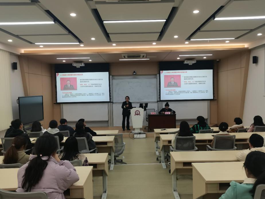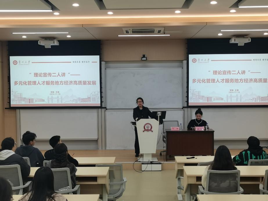 2024年11月18日,管理学院在致远楼102教室开展“理论宣传二人讲”活动,活动以多元化管理人才服务地方经济高质量发展为主题,由管理学院党委副书记邓琳与马克思主义学院教师王爽主讲,全院师生党员和入党积极分子、发展对象等师生代表60余人参加。