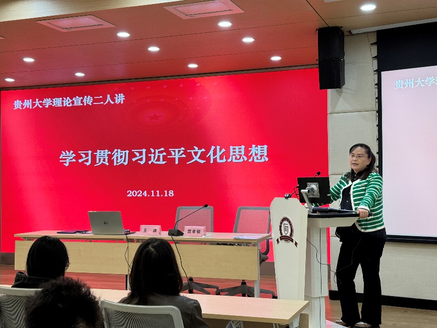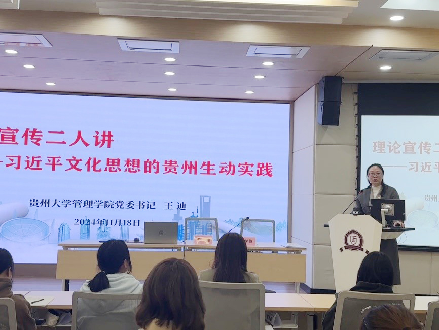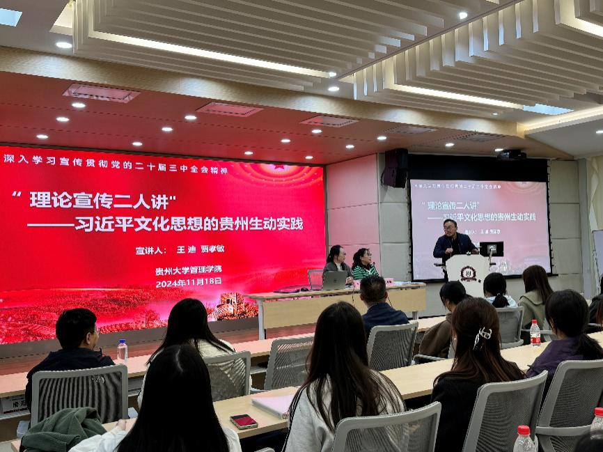 2024年11月18日中午,官方网站在致远楼305报告厅举办了主题“理论学习二人讲”,此次由管理学院党委书记王迪教授和马克思主义学院贾孝敏教授主讲《习近平文化思想的贵州生动实践》,学院教工支部、师生代表共120余人参加学习。会议由学院市场营销系党支部书记王军老师主持。