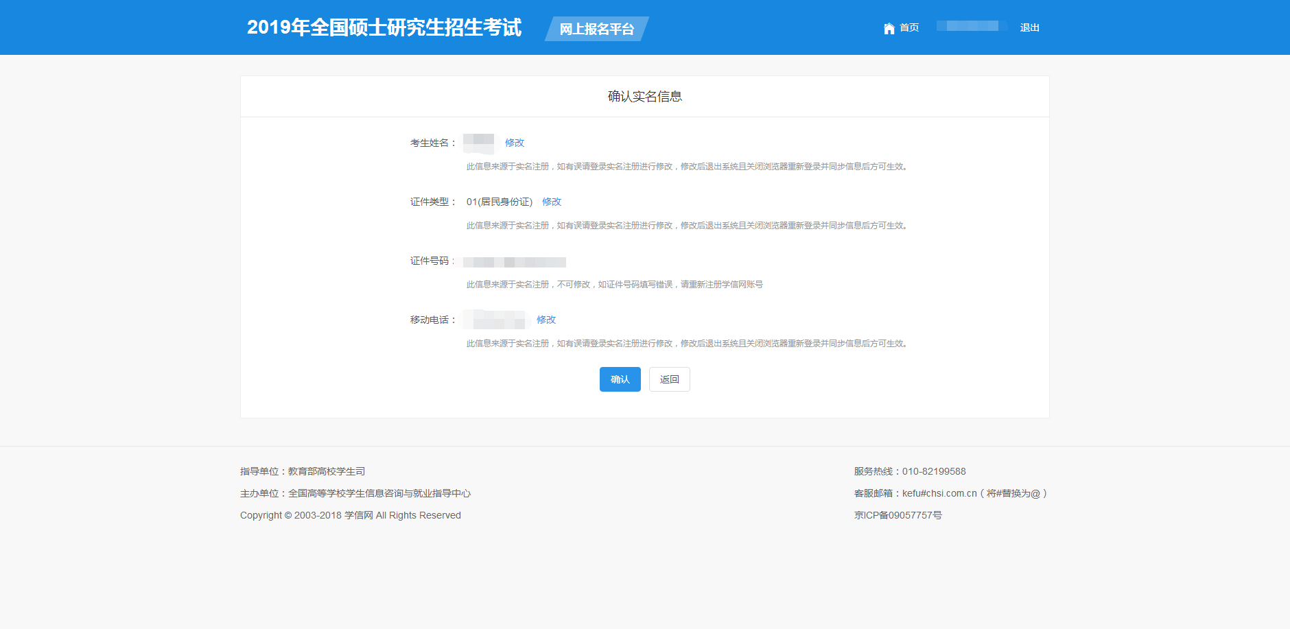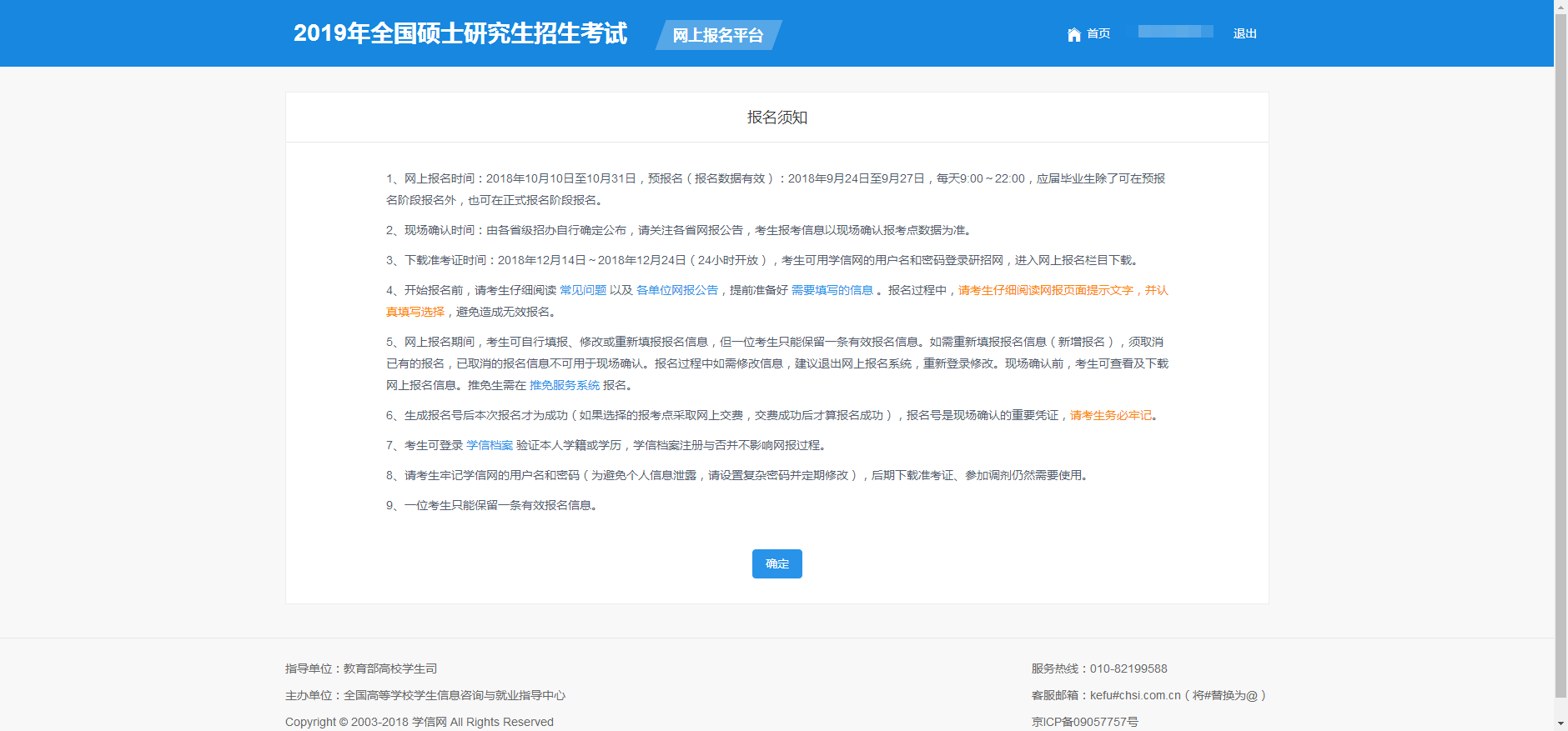 5. 现场确认时间在2018年11月10日之前,具体安排请查看各省级招办发布的网报公告http://yz.chsi.com.cn/sswbgg/