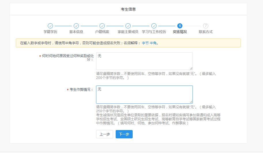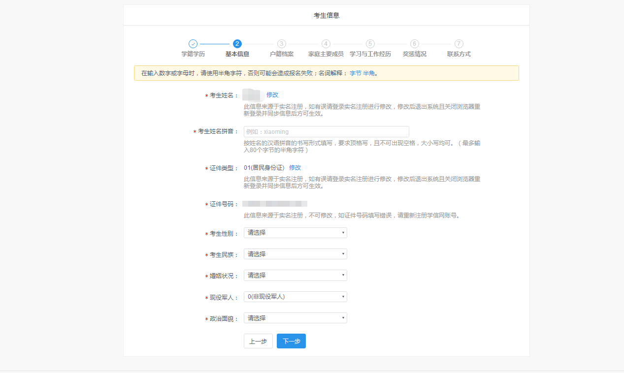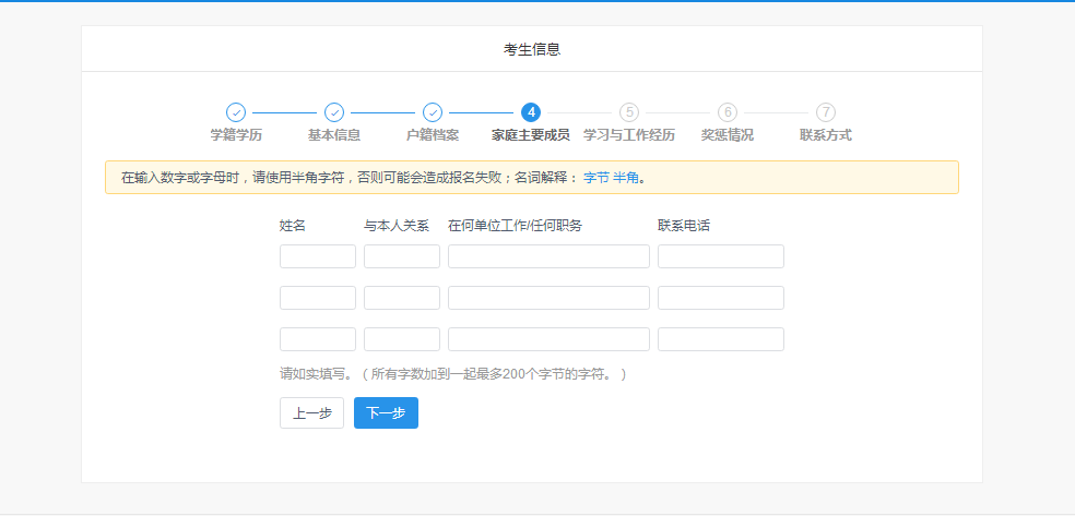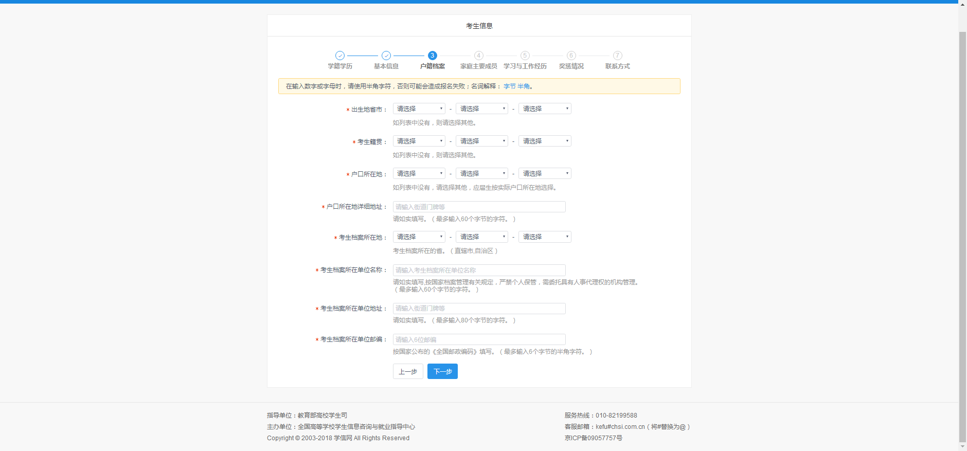 2. 顺次填写学籍学历→基本信息→户籍档案→家庭主要成员→学习与工作经历→奖惩情况→联系方式