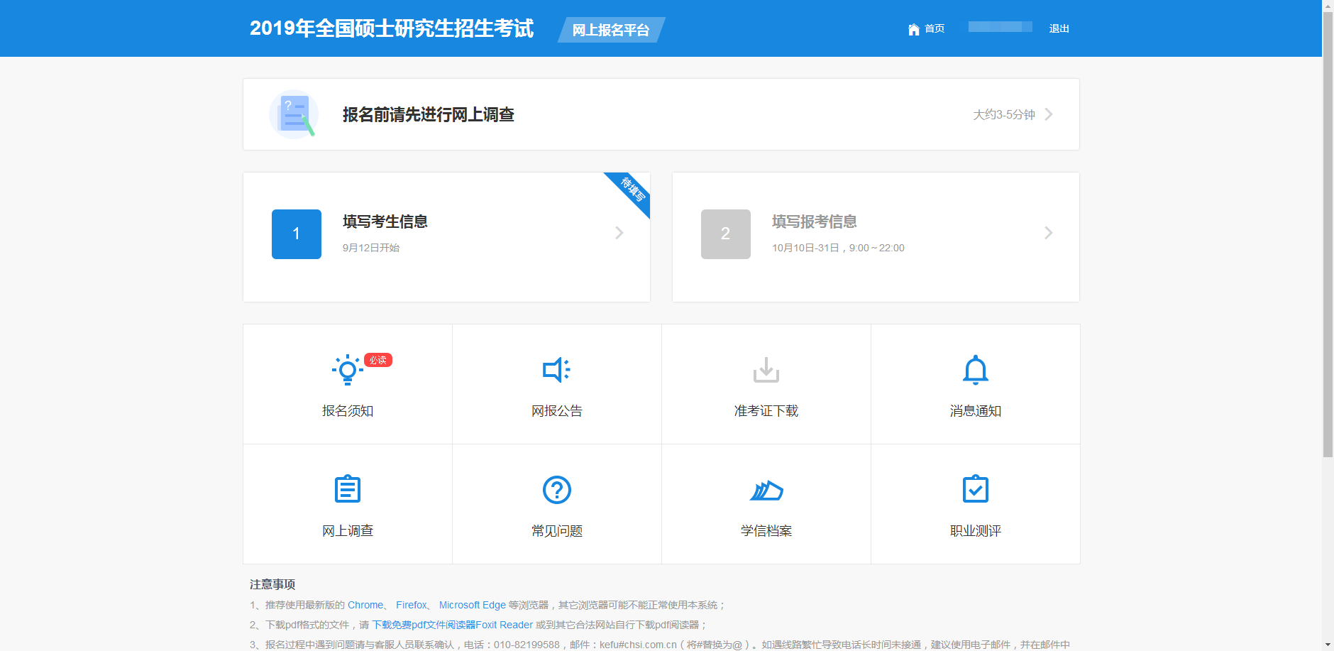 2. 请不要开启有网页拦截功能的软件;招生单位、考试方式、报考点等要慎重选择,一旦生成报名号后则不可以修改;如确实需要修改,进入本人报名信息页面点击取消报名,取消已有的报名再添加新的报考信息,已取消的报名信息不可用于现场确认;