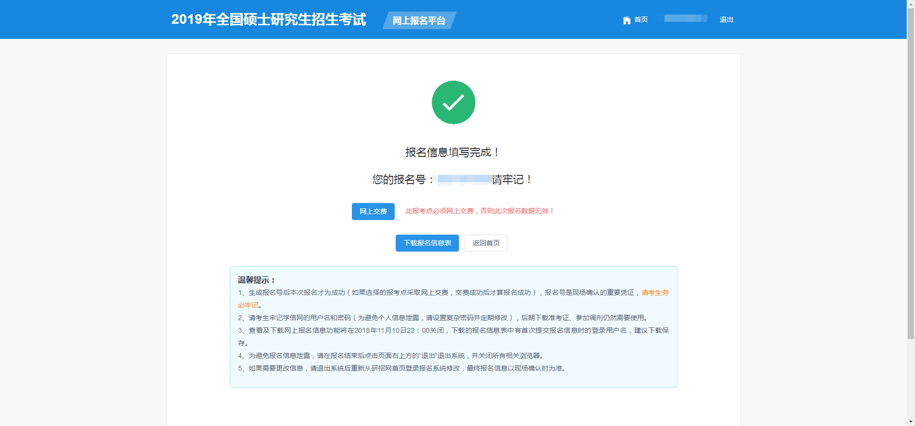1. 实名注册,请牢记注册的用户名和密码。注册用户直接与报名号对应,是查询报名号的唯一方法,在后期的信息查询、准考证下载和调剂系统中继续使用。报名期间,考生可自行修改网上报名信息或重新填报报名信息(一位考生只能保留一条有效报名信息),无需重复注册;