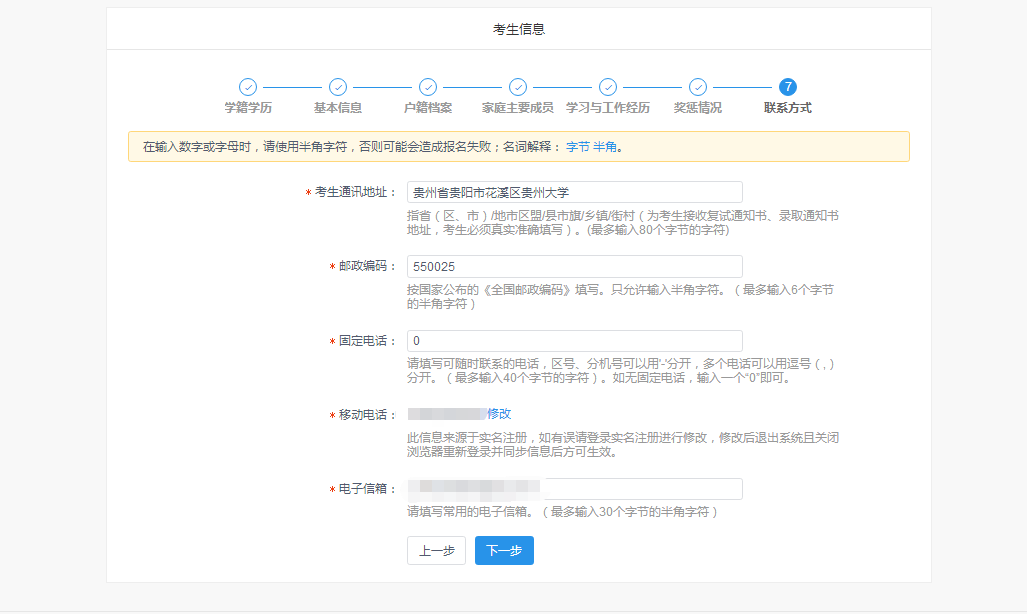 注意:一个考生只能报考一所学校的一个专业,生成一条报名信息,填错的只能重新填写提交。