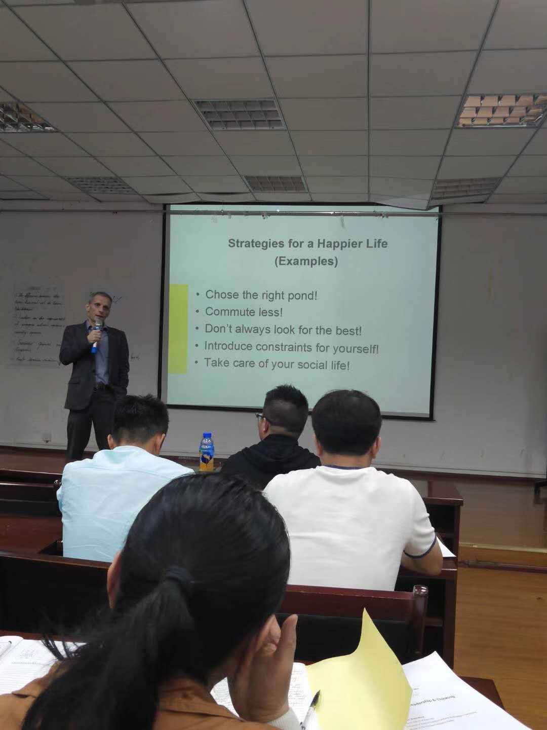 2019年5月31日14:00-16:00,leyuMBA教育中心邀请了瑞士西北应用科学与艺术大学的Mathias Binswanger教授为MBA学院讲座“幸福的跑步机( the Treadmills of Happiness)”。讲座在中心203教室成功召开,由贵州大学管理学院副院长周莉莉教授主持,MBA教育中心主任项凯标副教授、常务副主任何跃勇老师、贵州大学汤美润老师及中心其他工作人员和2016级、2017级、2018级各班同学等共计150余人参加讲座。