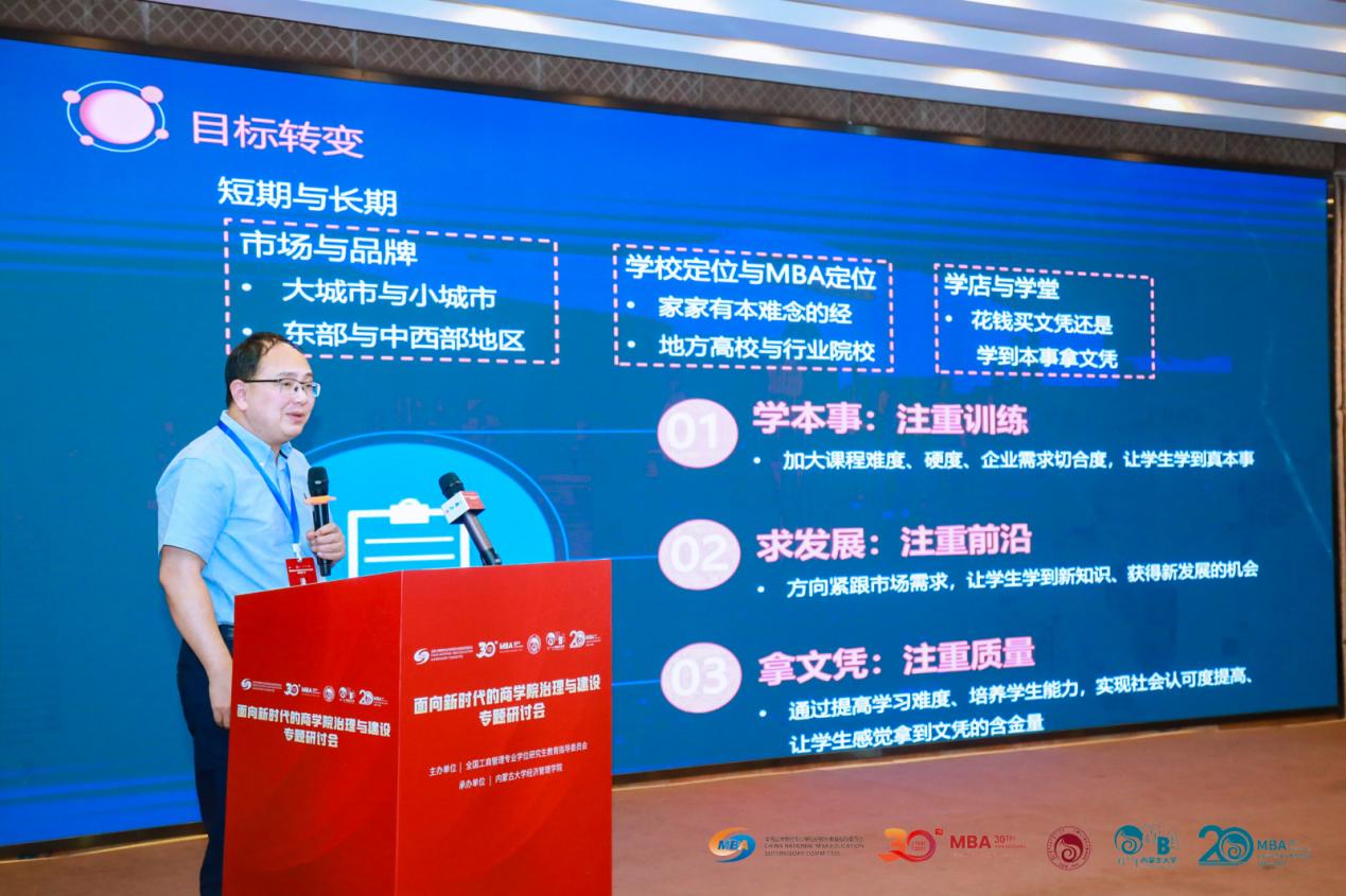 2021年7月29日,由全国工商管理专业学位研究生教育指导委员会(以下简称“全国MBA教指委”)主办,内蒙古大学经济管理学院承办的“面向新时代的商学院治理与建设”专题研讨会在呼和浩特市成功举办。leyu副院长周莉莉教授和MBA教育中心副主任何跃勇老师参加了此次研讨会。