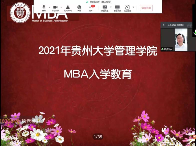项凯标教授介绍了贵州大学基本情况,以及学校对MBA学生在学业方面的具体要求。他指出,要强化考勤管理,加强纪律教育,细化学业考核,规范过程管控,提升论文质量。此外,还要求同学们多交流,实现平台共建、资源共享,共同发展,作为一名新贵大人,还要全力配合做好2022年120周年校庆和MBA20周年庆祝活动。