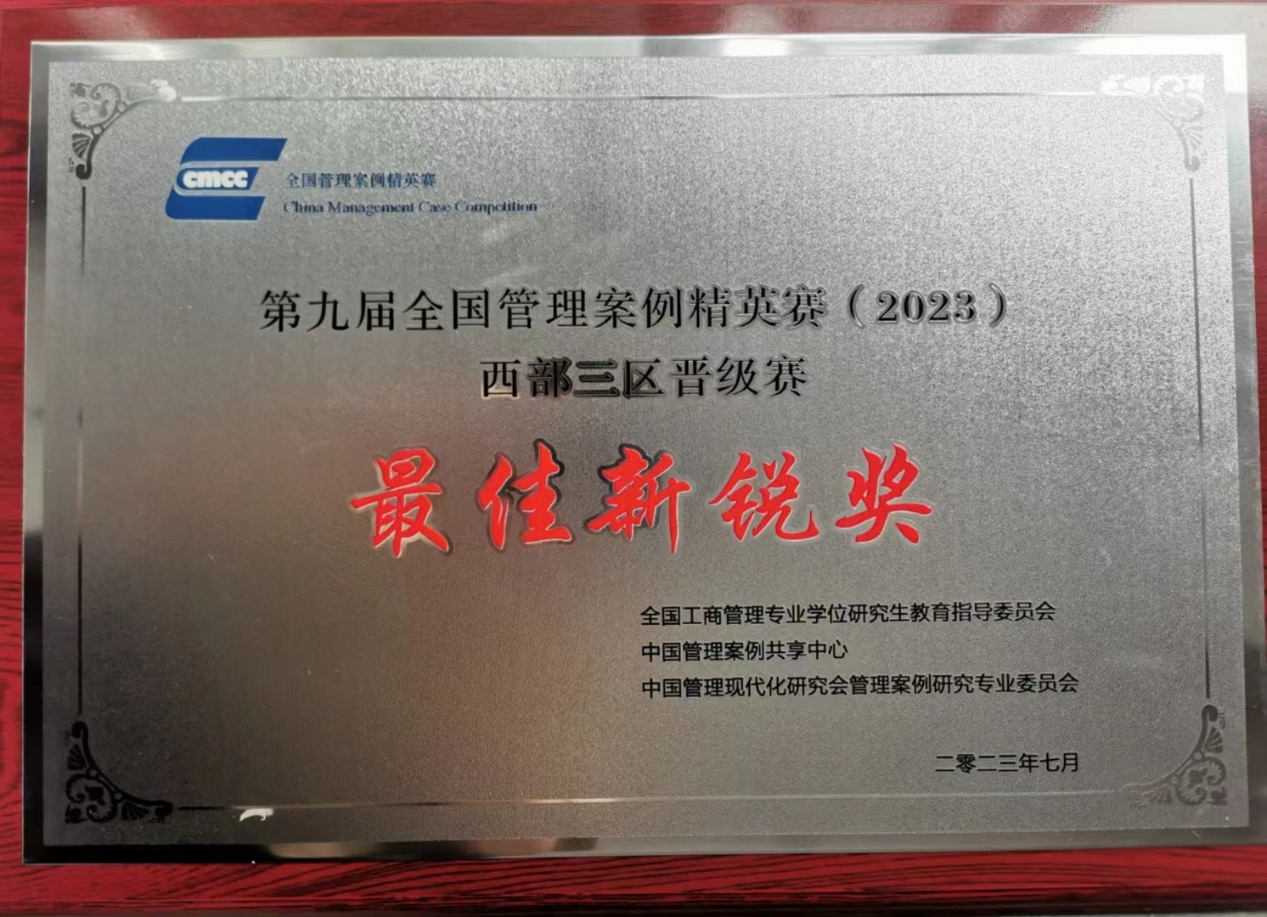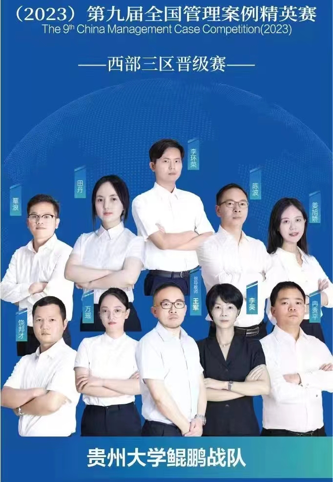 2023年7月23日,第九届全国管理案例精英赛西部三区晋级赛在重庆理工大学举行,官方网站9名MBA学员组成的鲲鹏战队在MBA导师王军副教授的指导下代表贵州大学参赛并获得最佳新锐奖。