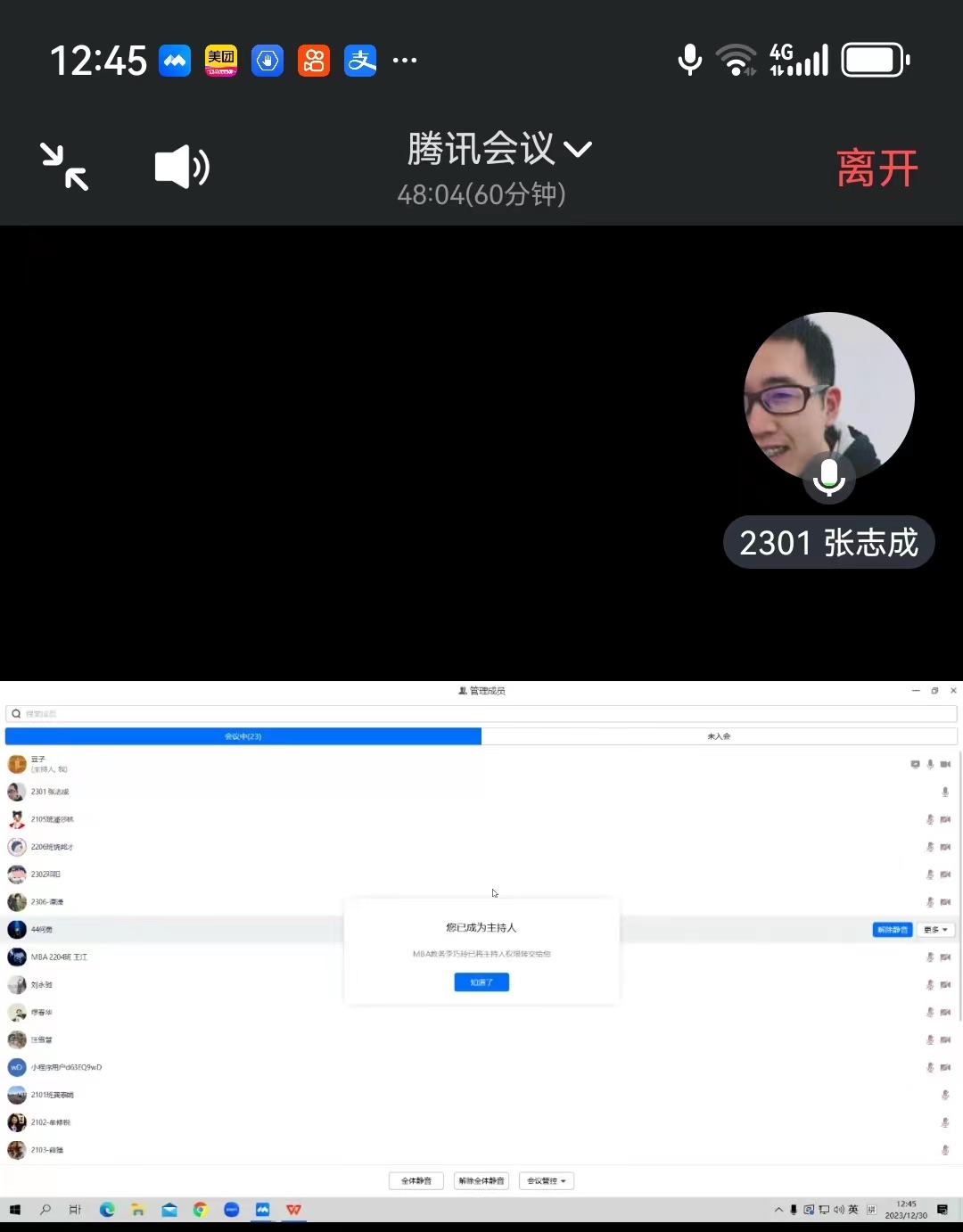 2023年12月30日,leyuMBA教育中心在慎思楼203教室举行了2022-2023第二学期班长例会。会议由MBA教育中心副主任何跃勇老师主持,MBA中心办公室主任芮丽华老师,中心李巧玲老师、凌聪老师、江滔老师、缪春华老师以及2021级、2022级、2023级各班班委等共计30人参加了此次会议。会议采取腾讯会议的方式进行。